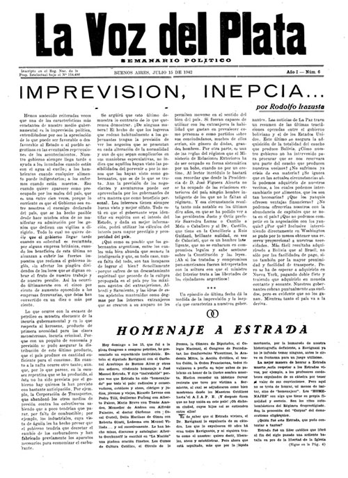 Semanario político nacionalista editado desde junio de 1942 hasta diciembre de 1943 por los hermanos Julio y Rodolfo Irazusta, quienes el 11 de octubre de 1942 fundaron en Córdoba el Partido Libertador. Voz del Plata, continuadora de Nueva República, desarrolló una intensa crítica al régimen aliadófilo vigente y reivindicó al radicalismo popular como una línea de tradición nacional, polemizando con otras corrientes nacionalistas. Formó parte del clima que alentó el golpe de 1943, aunque pronto sus editores se defraudaron y al confrontarla el semanario tuvo que dejar de publicarse en diciembre de ese mismo año por una serie de decretos gubernamentales que limitaban la actividad política y periodística, y que tuvieron como antecedente la censura sobre los números 61 y 62, que no fueron publicados según se indica en la portada de las ediciones 63 al 66 con el texto "número 61 y 62 suspendidas por la Oficina de Información y Prensa de la Presidencia". En Voz del Plata participaron algunos de las plumas más renombradas del nacionalismo, como los mencionados Irazusta, pero también Ramón Doll. Sus páginas también sirvieron para expresión de la Alianza Libertadora Nacionalista. De formato tabloide con 6 a 8 páginas por edición, la colección es una rareza de encontrar completa.