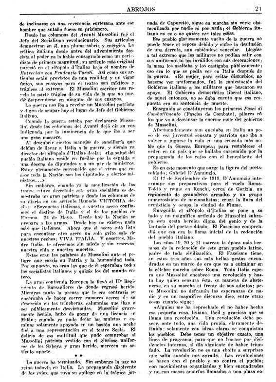 Abrojos fue la revista del Partido Nacional Fascista de Argentina, fundado en 1933 a semejanza de los partidos colegas de Italia y Alemania. De corta duración, pronto sus adherentes pasaron a formar parte de otras organizaciones nacionalistas como la Liga Cívica Argentina. Nacionalistas, anticomunistas, antisemitas e intolerancia política, se destacan en los únicos dos números publicados.