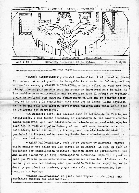 Clarín nacionalista fue publicada por filial de Rosario, Provincia de Santa Fe, de la Alianza Nacionalista Argentina. En formato mimeografiado, el boletín revela el carácter nazista, nacionalista, beligerante, contrario al sistema de partidos políticos, y demás fanatismos que en nombre de Dios, la raza y de la Patria caracterizan al nacionalismo argentino nacido en la década del 30.